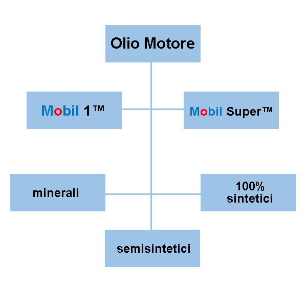 Le linee Mobil 1™ e Mobil Super™ sono prodotti in grado di soddisfare tutte le esigenze, infatti con i lubrificanti Mobil 1™ il cliente ha a disposizione un'ampia gamma di lubrificanti a tecnologia avanzata ed una competenza riconosciuta dai consumatori, dai costruttori e dagli OEM di tutto il mondo. Le linee di oli motori, come possiamo vedere dal diagramma, sono disponibili con i marchi Mobil 1™ e Mobil Super™ nelle formulazioni minerali, semisintetici e 100% sintetici (alte prestazioni).